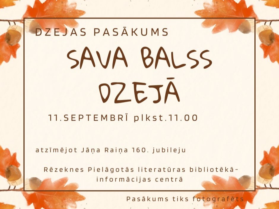 2025. gada 11. septembrī plkst. 11.00 Rēzeknes Pielāgotās literatūras bibliotēkā-informācijas centrā (RPLB-IC) notiks tematisks pasākums “Sava balss dzejā”, kurā bibliotēkas apmeklētājus aicinām kopā svinēt Dzejas svētkus. Pasākums veltīts izcilā latviešu dzejnieka Jāņa Raiņa 160. jubilejai un Dzejas dienu 60. gadadienai.