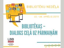 No 2019. gada 22. līdz 28. aprīlim Latvijā noritēs Bibliotēku nedēļa, un tas parasti ir laiks, kad bibliotēkas ar dažāda veida norisēm pastiprināti pievērš uzmanību sev, savam darbam un bibliotēku nozīmei sabiedrībā.
