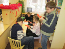 Radošā darbnīca darbojas arī Mīlētāju dienā, tādēļ ikviens Bērnu bibliotēkas apmeklētājs arī šodien var izveidot skaistu dāvaniņu savam pasaulē vismīļākajam cilvēkam.