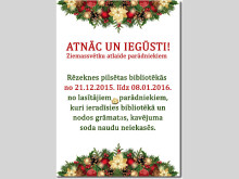 Ziemassvētku atlaides bibliotēkās Tuvojoties Ziemassvētkiem, Rēzeknes pilsētas bibliotēkas – centrālā, 2. bibliotēka, bērnu bibliotēka un specializētais grāmatu izsniegšanas punkts (Medicīnas bibliotēka) – no 2015. gada 21. decembra līdz 2016. gada 8. janvārim izsludina akciju „Atnāc un iegūsti. Atlaide parādniekiem”.