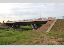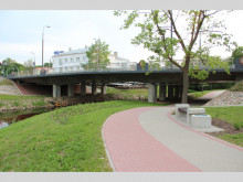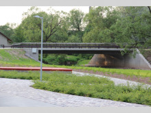 Foto: www.rezeknesbiblioteka.lv Tālāk esošais auto transporta tilts izbūvēts, lai atvieglotu transporta piekļuvi koncertzālei un savienotu pilsētu taisnā virzienā no Pils ielas uz Viļānu ielu un tālāk uz staciju Rēzekne I, kā arī lai atvieglotu satiksmi Atbrīvošanas alejas – Brīvības ielas virzienā.