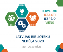 Arī šogad (no 20. līdz 26. aprīlim) norisināsies Latvijas Bibliotekāru biedrības izsludinātā Bibliotēku nedēļa, tās tēma šoreiz ir “Iedvesmo, iesaisti, iespējo, vieno”. Bibliotēku nedēļa ir laiks, kad bibliotēkas ar savām aktivitātēm pastiprināti pievērš uzmanību sev, savam darbam un profesijai, kā arī bibliotēku nozīmei sabiedrībā.