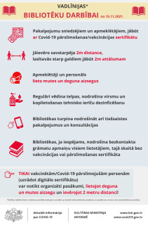 Pasākumi bibliotēkās notiks “zaļajā režīmā” – apmeklētāji vakcinēti/Covid-19 pārslimojuši, uzrādot derīgu Covid-19 sertifikātu. Saudzēsim sevi un cilvēkus sev blakus!