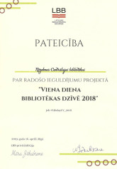 Rēzeknes Centrālā bibliotēka saņēma pateicības rakstu par radošo ieguldījumu projektā „Viena diena bibliotēkas dzīvē 2018 jeb #Libday_2018”, ko organizēja LBB Jauno speciālistu sekcija.