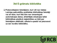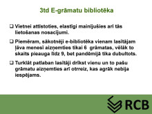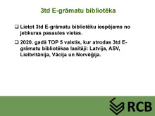 Rēzeknes Centrālās bibliotēkas abonementa vadītāja Zita Gorsvāne bija sagatavojusi prezentāciju, kurā iepazīstināja ar e-grāmatu lasīšanas iespējām publisko bibliotēku lasītājiem un pastāstīja, kā ikviens no mums var kļūt par e-grāmatu lasītāju. Prezentācijas slaidus piedāvājam noskatīties zemāk.