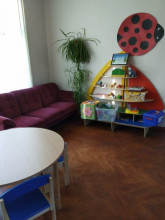 Ierīkots bērnu stūrītis ar spēlēm, zīmēšanas un krāsošanas piederumiem, rotaļlietām.