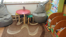 Ierīkots bērnu stūrītis ar spēlēm, puzlēm, zīmēšanas piederumiem, izkrāsojamām lapām, rotaļlietām.