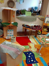 Ierīkots bērnu stūrītis ar spēlēm, zīmēšanas, krāsošanas piederumiem un rotaļlietām.