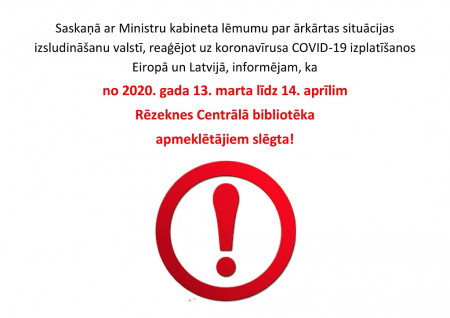 ❗️No 13. marta līdz 14. aprīlim klātienes apmeklējumiem SLĒGTAS Rēzeknes Centrālā bibliotēka (Atbrīvošanas alejā 81), Rēzeknes 2. bibliotēka (Atbrīvošanas alejā 166), Rēzeknes Bērnu bibliotēka (Dārzu ielā 37), kā arī Specializētais grāmatu izsniegšanas punkts (Medicīnas bibliotēka) (Zemnieku ielā 16).