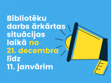 Sakarā ar valstī noteikto kārtību Covid-19 izplatības ierobežošanai Rēzeknes publiskās bibliotēkas (Rēzeknes Centrālā bibliotēka, Rēzeknes 2. bibliotēka, Rēzeknes Bērnu bibliotēka un specializētais grāmatu izsniegšanas punkts (Medicīnas bibliotēka)) no 2020. gada 21. decembra līdz 2021. gada 11. janvārim klātienes apmeklējumiem būs slēgtas.