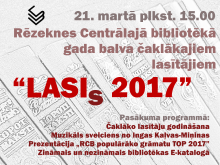 Gada balva “LASIS 2017” 2018. gada 21. martā plkst. 15.00 Rēzeknes Centrālā bibliotēka (RCB) aicina uz čaklāko un aktīvāko lasītāju godināšanas pasākumu “LASIs 2017”. Pasākumā septiņās nominācijās tiks godināti aktīvākie bibliotēkas apmeklētāji, grāmatu un periodikas lasītāji, aktīvākā ģimene bibliotēkā, interneta lietotāji un uzticīgākie lasītāji.