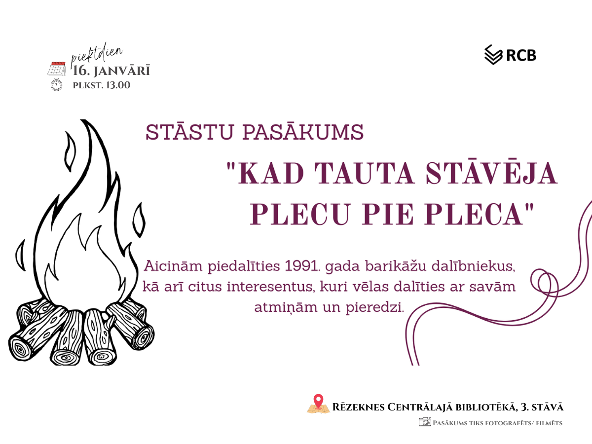 16. janvārī plkst. 13.00 Rēzeknes Centrālajā bibliotēkā notiks stāstu pasākums “Kad tauta stāvēja plecu pie pleca”. Bibliotēka aicina barikāžu piemiņas nedēļā pulcēties uz sarunām ar cilvēkiem, kuri savām acīm redzēja un savām rokām sargāja brīvību.