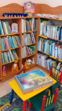 Ierīkots bērnu stūrītis ar spēlēm, zīmēšanas un krāsošanas piederumiem, rotaļlietām.
