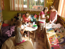 Ierīkots bērnu stūrītis ar spēlēm, zīmēšanas un krāsošanas piederumiem, rotaļlietām.